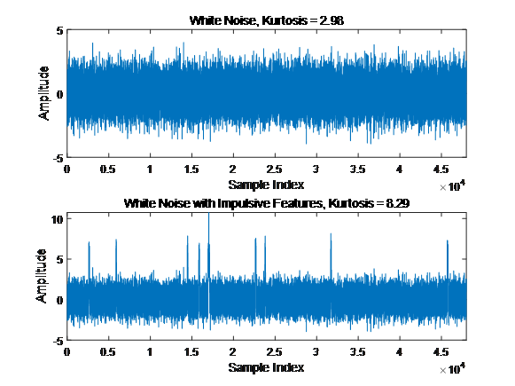 這樣服從正態(tài)分布的數(shù)據(jù)的峰度值為0,因為正態(tài)分布的四階中心矩與方差平方的比值恰好等于3。簡單來說,峰度可以用來描述信號的非平穩(wěn)特性,尤其是短時間內突發(fā)的噪聲干擾,如果一段數(shù)據(jù)的峰度值越大,則表明該段數(shù)據(jù)中含有的突發(fā)性噪聲干擾成分較多。下面以一段數(shù)據(jù)分析對比為例,采用信號仿真方法生成一組隨機白噪聲信號和一組添加有突發(fā)性沖擊干擾的白噪聲信號,分別計算兩組信號的峰度值可以發(fā)現(xiàn),含有突發(fā)性沖擊特征干擾的白噪聲信號的峰度值為8.29,明顯大于不含有干擾的白噪聲信號2.98。